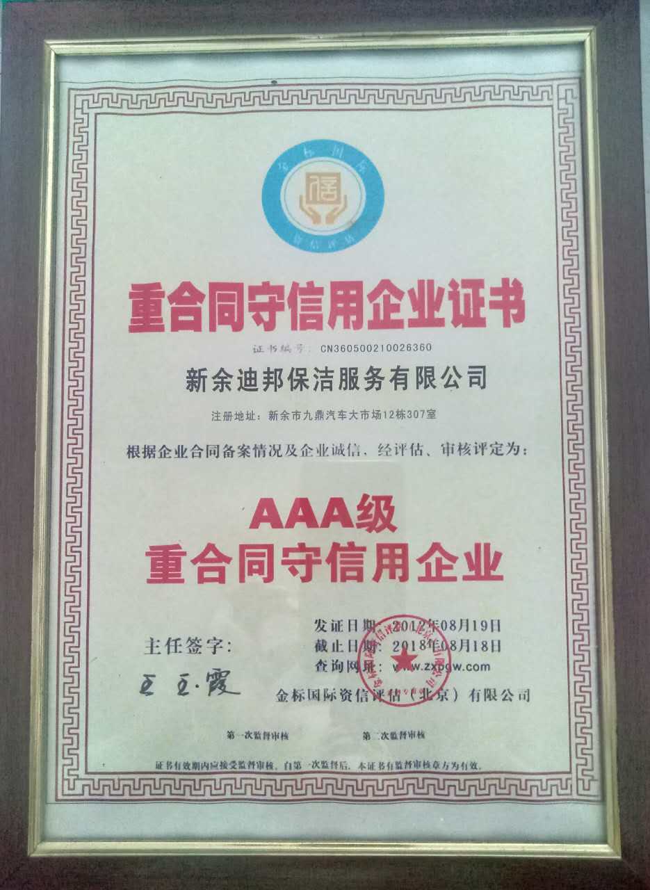 新余迪邦保潔服務有限公司獲得北京金標國際資信有限公司評為AAA級重合同守信用企業(yè)
